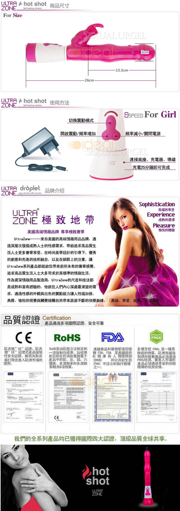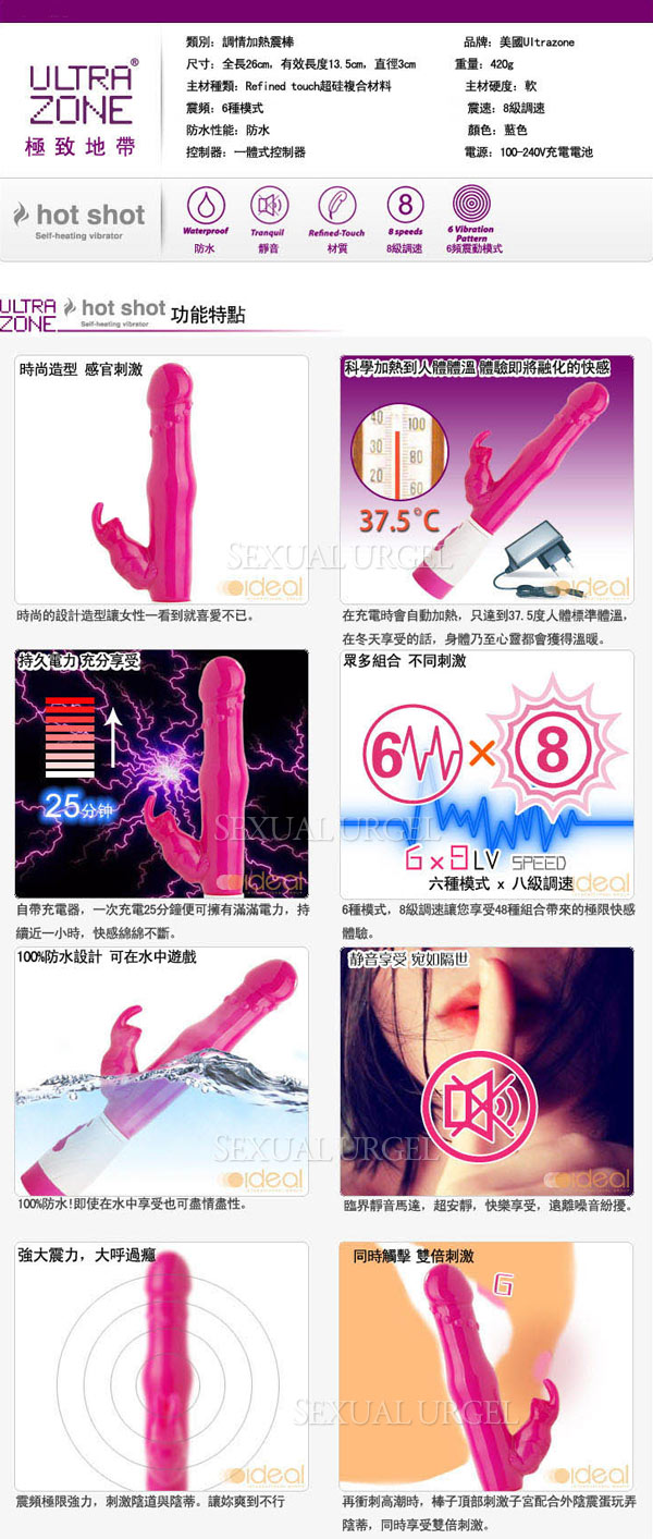 .主商品:美國 Ultrazone Hot shot-Rabbit 熱情兔子 加熱充電按摩棒 粉紅色x1