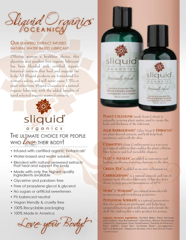 Sliquid Gel 海洋系列 水基保濕潤滑液,除了純天然植物成分外,還加入紫菜、裙帶菜、天然海澡提取物,純天然的成份,給予肌膚百分百的呵護及滋潤。