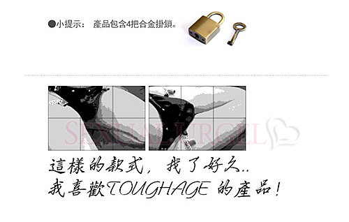 穿上並鎖起來! 這是一條性感的男士内褲,優質.PU皮革縫製,腰間鑲有一條鏡面皮革, 内襯毛巾绒,吸汗且透氣,利於長時間穿著。 特别的設計是:腰圍、胯下及大腿部設置金屬鏈條,並配置4把合金掛鎖。利用鏈條和鎖, 可以牢固的將男性器官嚴密包裹。此外,由於胯下及大腿部僅有鏈條圍繞,因此整個屁股 是完全顯露的,帶來性感和有趣的感覺。 功能方面我們已經提到,它可將男性器官嚴密包裹起來,没有鑰匙打開掛鎖,整條内褲是 無法脱下的。因此,您可以想到:用它來鎖住您的愛人後,他便無法進行性交。