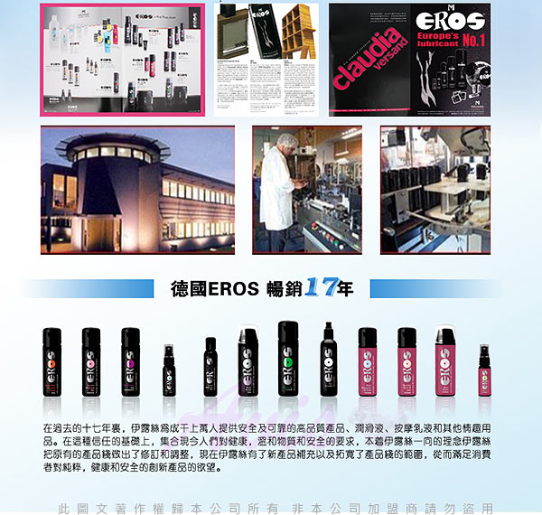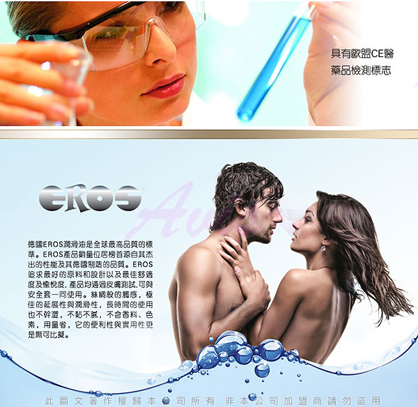 德國原裝進口製造.全球性潤滑劑中的領導品牌,頂級的潤滑油如絲綢般的觸感,極佳的持久潤滑與貼近肌膚的感受性.來自德國的Eros 是Pjur的姊妹牌,長時間的使用也不乾澀,不黏不膩,