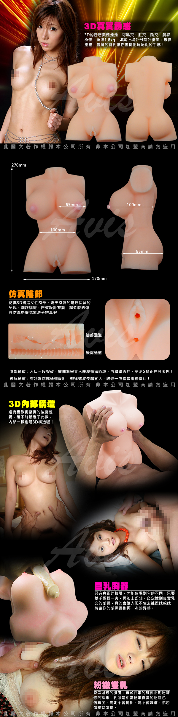 外形設計優美,線條流暢,豐滿的雙乳讓你盡情把玩絕對的手感;仿真3D構造女性陰部、嬌美陰唇的毫無保留的呈現,細緻嬌嫩,陰道設計窄緊,超柔軟的彈性體仿真得讓你無法分辨真假;豐滿的線條,性感的視覺效果……讓你隨時都有一個充滿激情與浪漫夜晚。還有喜歡更緊實的後庭性愛,絕不能錯過了,內部一樣也是3D構造喔