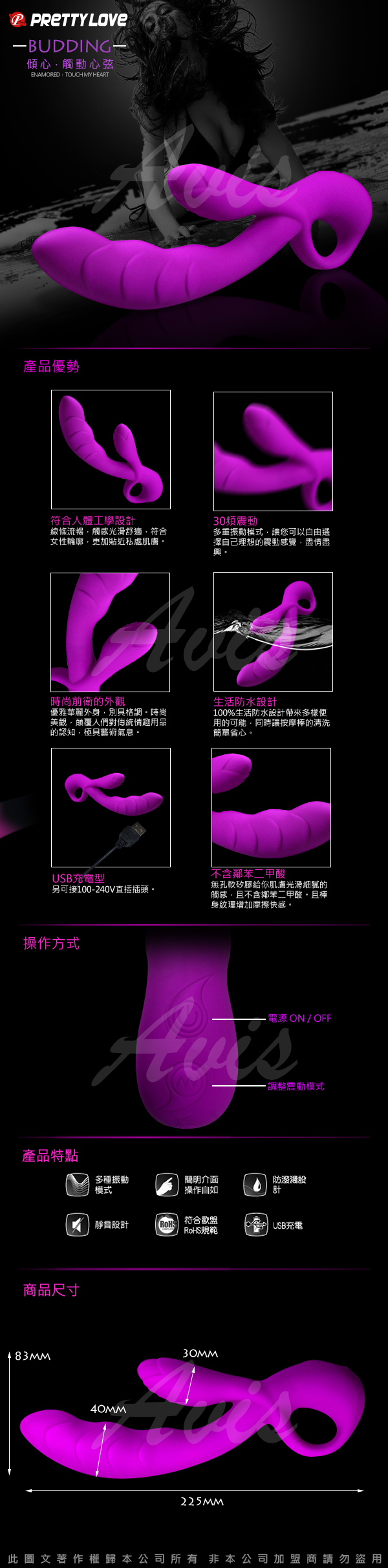 30頻雙馬達超強震動、全硅膠、充電、防水