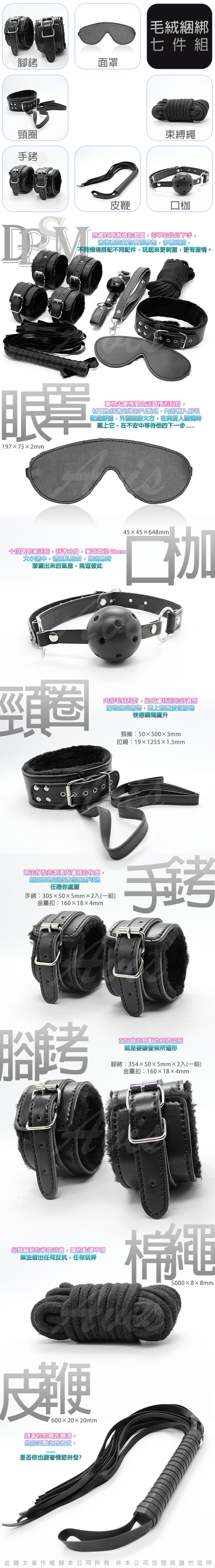 .商品內容:虐戀精品CICILY-束縛遊戲-眼罩手銬腳銬口枷頸圈皮鞭棉繩 七件套組 黑