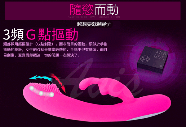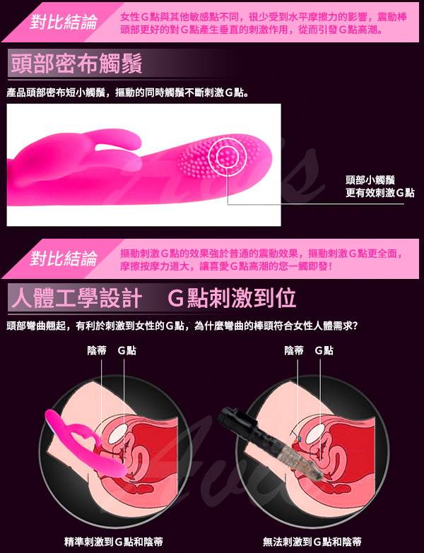 有別於一般按摩棒設計,是專為剌激女性G點高潮,開發女性潮吹專用的按摩棒, 最特別就是在棒身頭部的地方,是設計上下往複式蠕動,就像是手指上下摳動一樣,只要使用按摩棒插入陰道後,找到女性G點所在位置,用頭部頂住後,只要開啟蠕動模式,就可直接針對G點部位進行最強烈的剌激,再啟動震動模式,雙重剌激下,保證可在最快時間內讓女性達到高潮潮吹境界。
