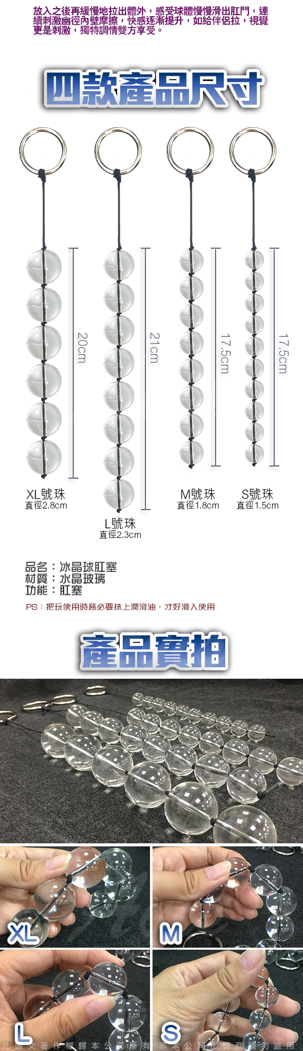 .商品內容:水晶之戀 玻璃後庭拉珠 男女通用 S 10連珠 直徑1.6CM