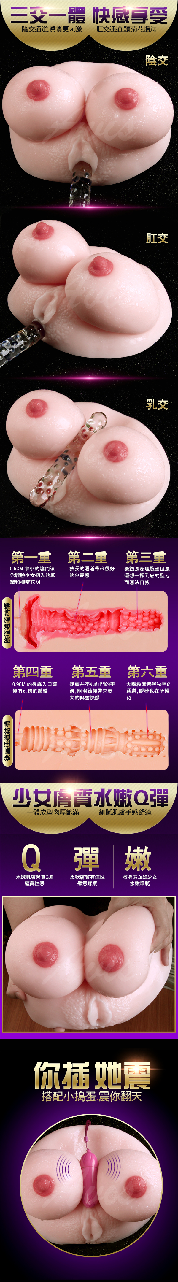 乳暈、乳頭都真實的重現,當然只有這樣還不夠滿足你,所以新開發了這多功能的自慰器,將胸部與陰部結合在一起,對於喜歡輕鬆玩樂的玩家來說,這是最好的選擇,
