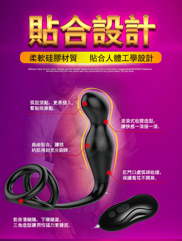 鎖陽電動前列線刺激器震出您激情快感,鎖陽束精使用三重鎖陽鎖根固蛋減緩您血液回流速度使老二上翹堅挺!後庭按摩貼合的黃金彎曲設計輕鬆刺激您的前列線讓高潮更舒適讓您進入另一種境界。搭配強悍的12段持續震動快感模式增強您的快感享受給您意想不到的酥麻享受。採用如天鵝絨般舒適細膩的環保矽膠讓您放心使用,更有貼心的靜音防水功能讓您不論在哪都能盡情解放您的慾望!