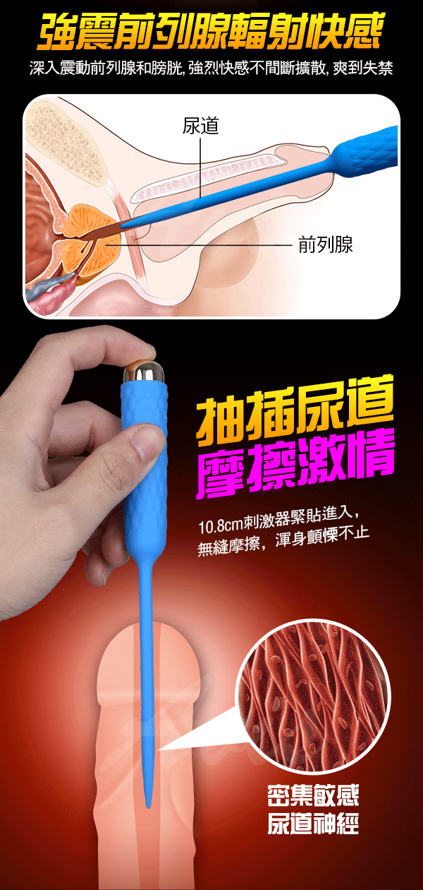 探索尿道刺激器攪弄尿道男人也會潮吹!此款採用軟體矽膠輕柔不怕受傷!刺激尿道,酥麻快感循環襲擊,使高潮在臨界點邊緣徘徊,直到汁液噴射,比女性潮吹來要猛烈。3速7頻高頻震動又插又震的使您快活似神仙!震顫尿道多處敏感點,帶來被充實的飽漲感