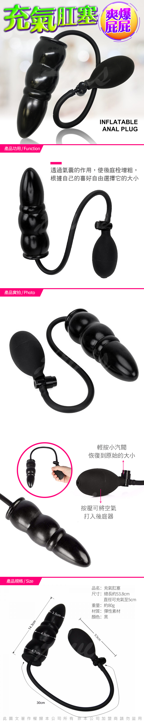 充氣後表層彈性的材質會脹大,體驗慢慢擴肛的感受,只要輕壓充氣球,