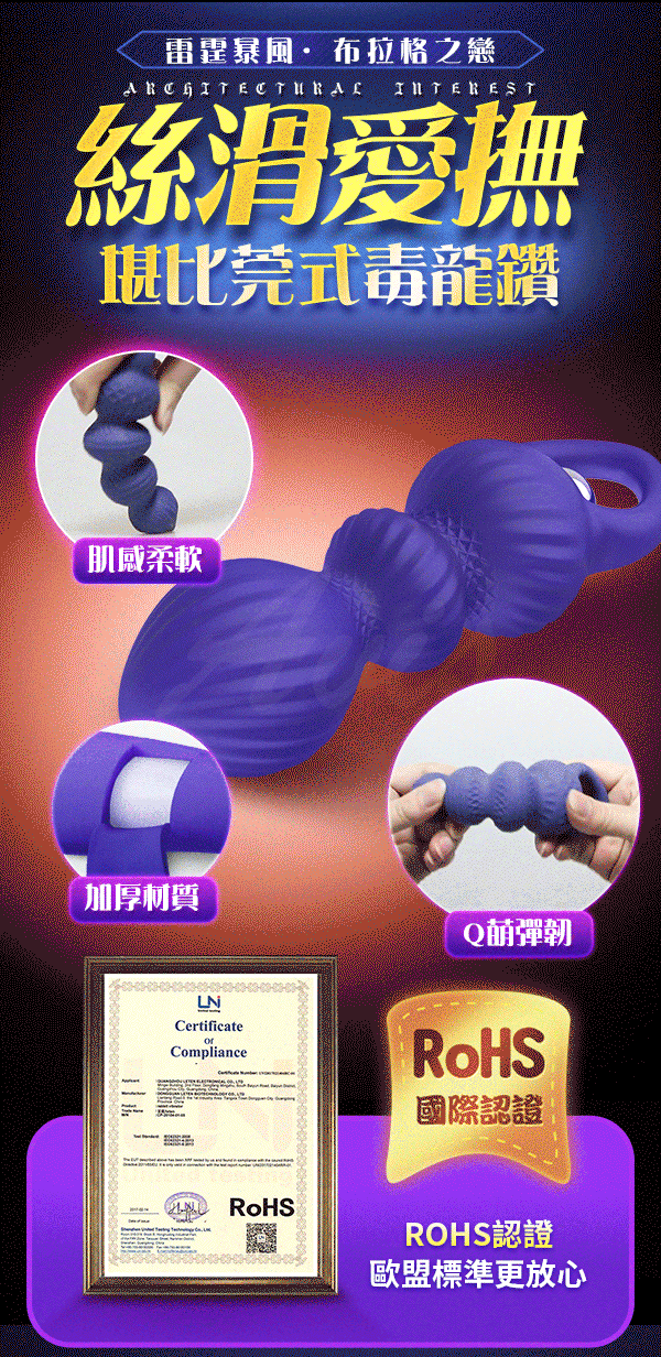 布拉格之戀震動後庭塞充滿著異域戀情,巧妙的與特色建築融合型成錯綜肌理,混合刺激。徹底釋放心中狂野慾望,體驗後花園獨特的異域風情,在深層快感中淪陷。設計10種震顫節奏,從柔情到歡快花式玩法,讓各種快感層層襲來。全身矽膠成型,任意泡在水中不怕髒,易於清洗可隨時激戰。