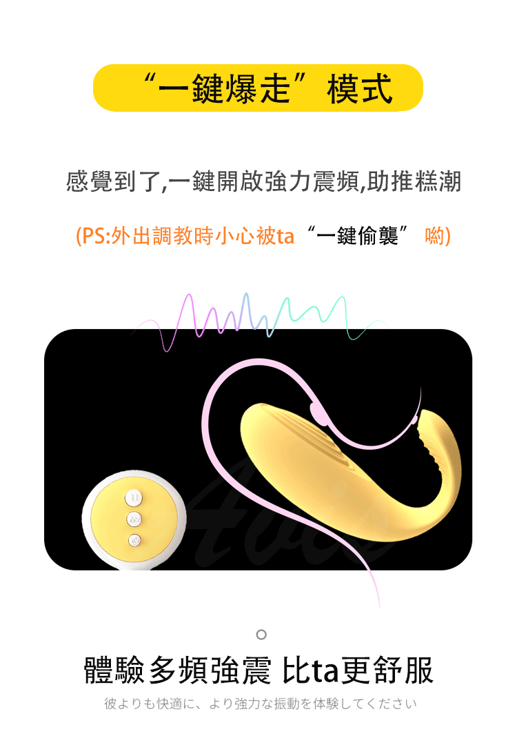 10種頻率不同玩法。跳蛋採U型彈性尾部溫柔貼合人體外肛/陰部線條,讓您可外出使用,搭配無線遙控讓您與愛人更加貼近喔