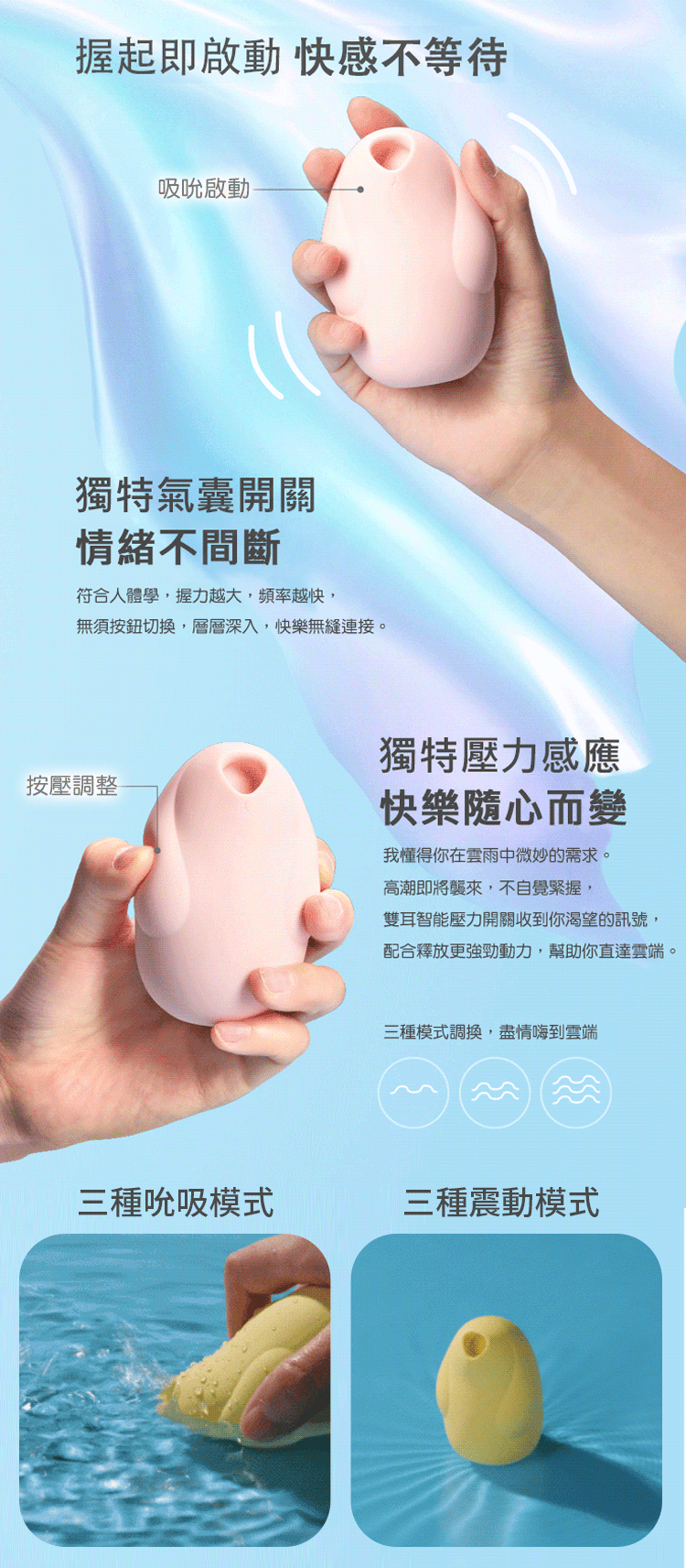 根據人體工程學設計,手握的兩側兔耳朵內設置有壓力開關,能敏銳的感知你即將高潮前手緊握的力度,從而加大吮吸力,輕鬆進入高潮,獲得快感,無需尋找按鈕~進行切換