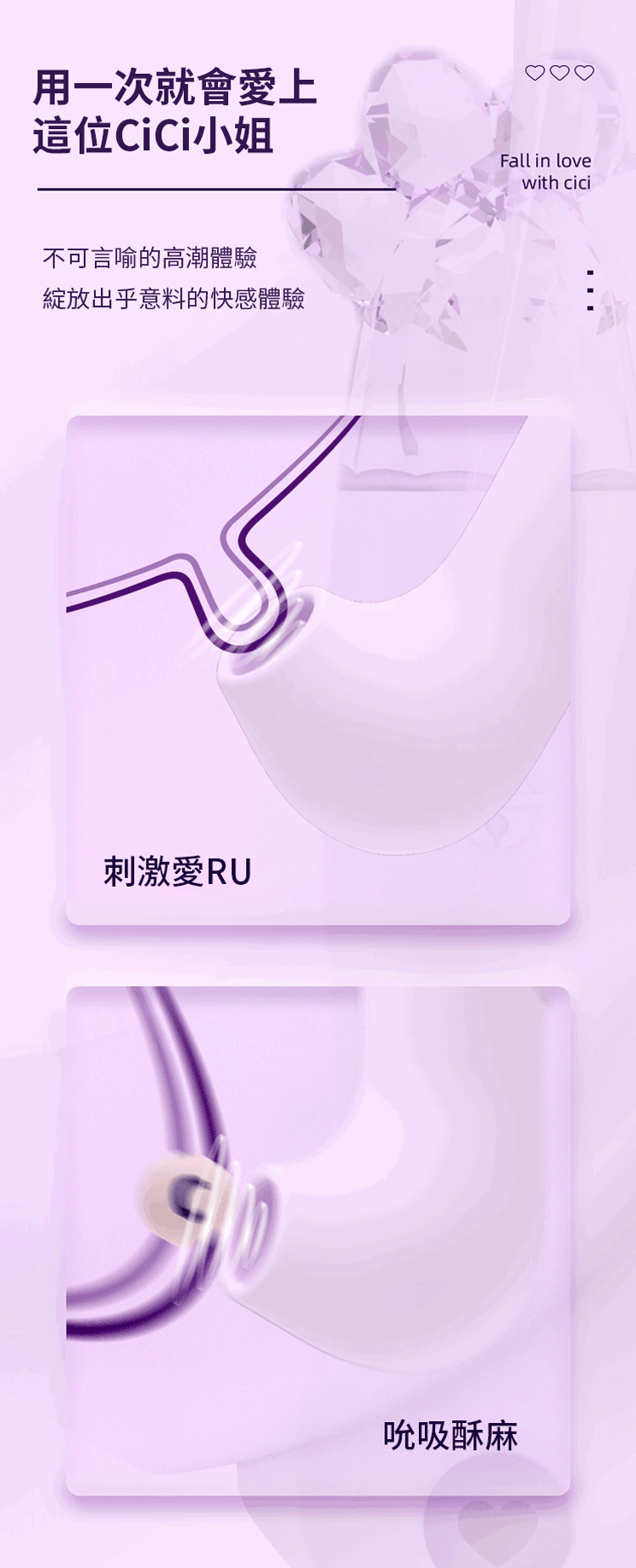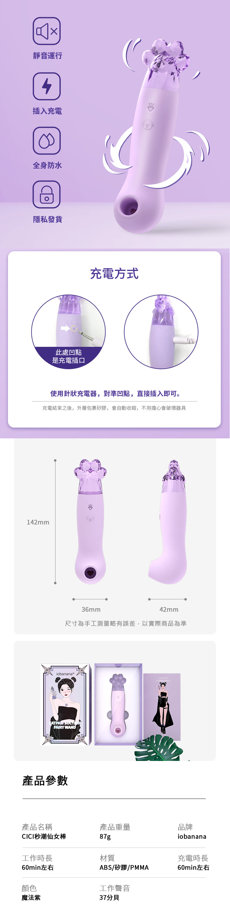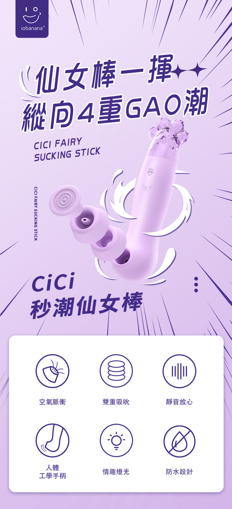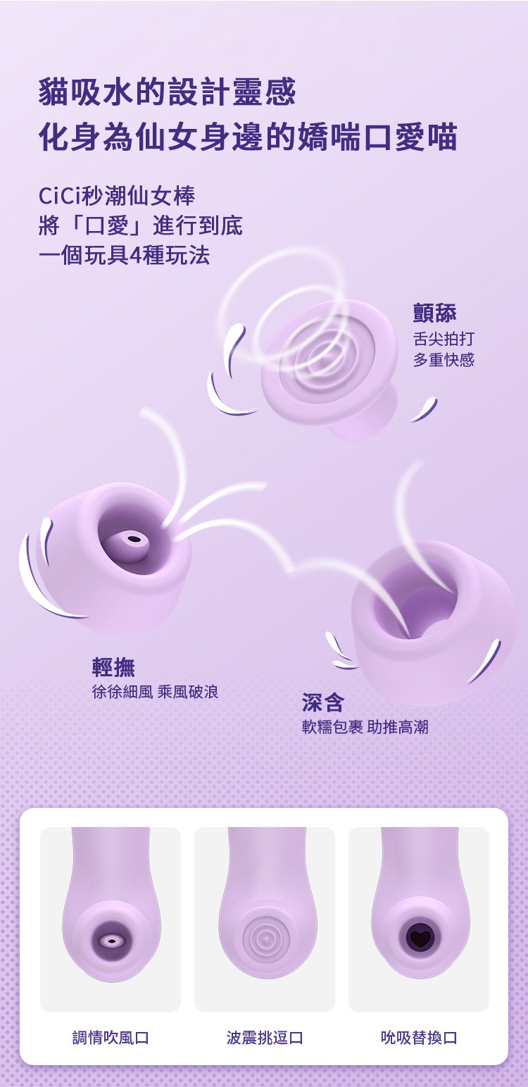 產品名稱:iobanana-CiCi吸吸喵掌 健康吸吮按摩器工作時長:60min左右顏:魔法紫產品重量:87g材質:ABS/矽膠/PMMA工作聲音:37分貝