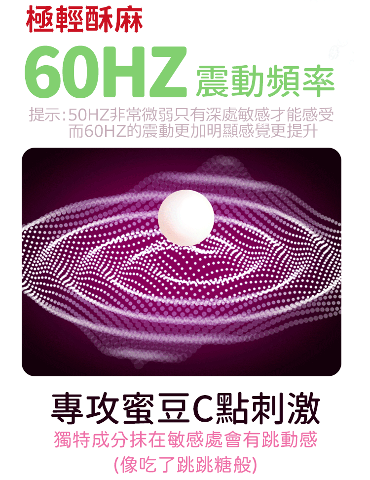 具有獨特震動感,類似跳跳糖帶給您跳動感覺,有助於女性自身分泌潤滑液。