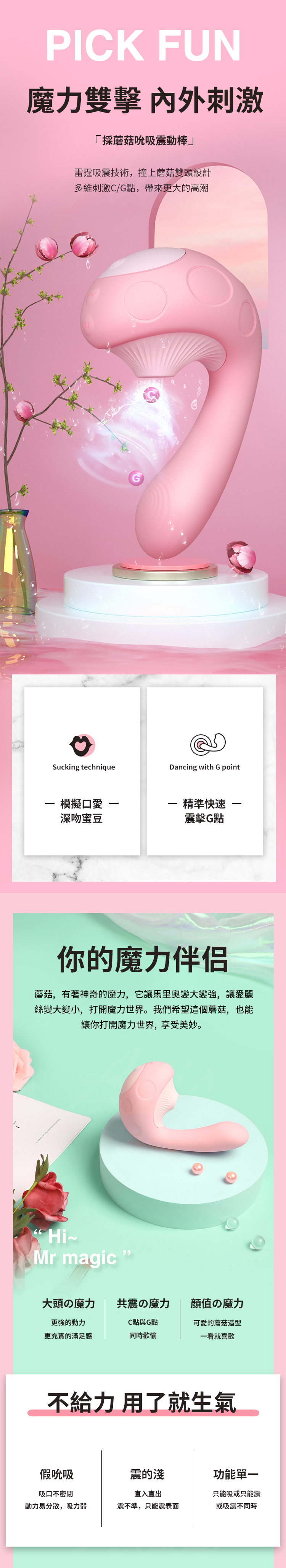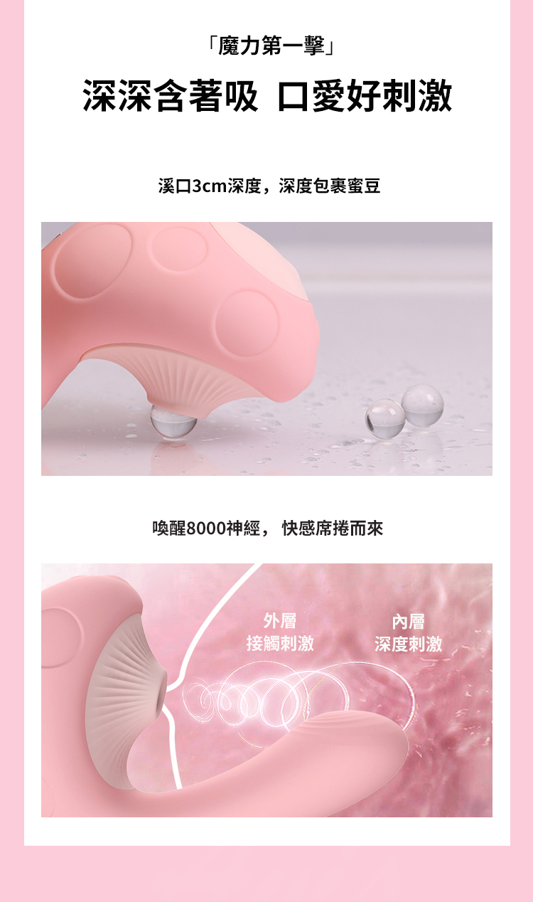採蘑菇吮吸震動棒,撞上蘑菇雙頭設計多維刺激C/G點,帶來更大的高潮。魔力雙擊蜜豆G點同時爽,強吸+深震,帶來內外全面高潮。模擬口腔真空緊緊吸,爽到腿無力。吸震同時配合30種模式,多維刺激變幻花式快感。