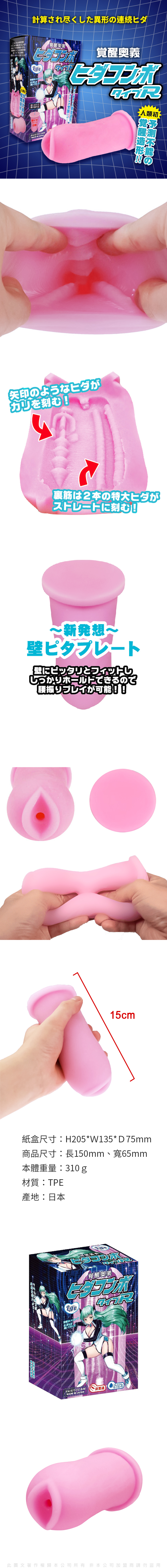 特別設計的襞紋就像箭頭一樣雕刻著龜頭。接著是像山嶽一樣的三組襞紋,將龜頭推向高峰,不斷刺激。最後,使用雙突起的亀頭衝擊將您帶到頂峰。而背面的結實襞紋則以兩條特大襞紋直線刻劃著。