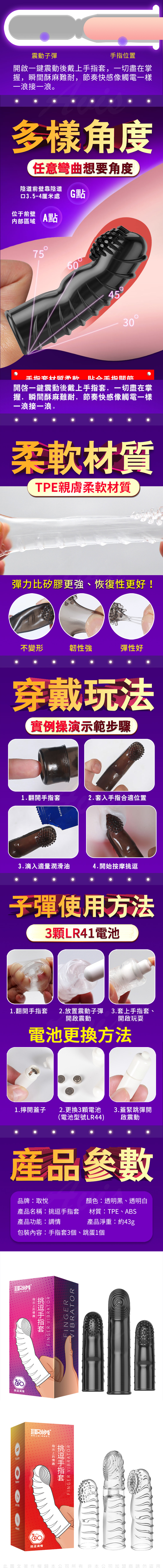 產品名稱:取悅|挑逗震動手指套3入|透明品牌:取悅 顏色:透明黑、透明白材質:TPE、ABS產品功能:調情 產品淨重:約43g包裝内容:手指套3個、跳蛋1個
