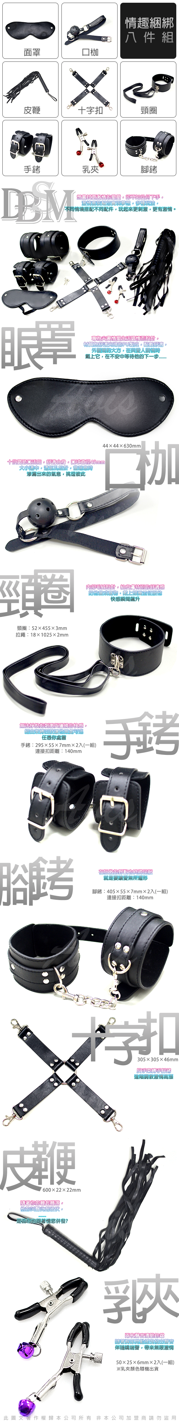 八件組: 眼罩/口塞/皮鞭/十字扣/頸圈/手銬/乳夾/腳銬 八件組