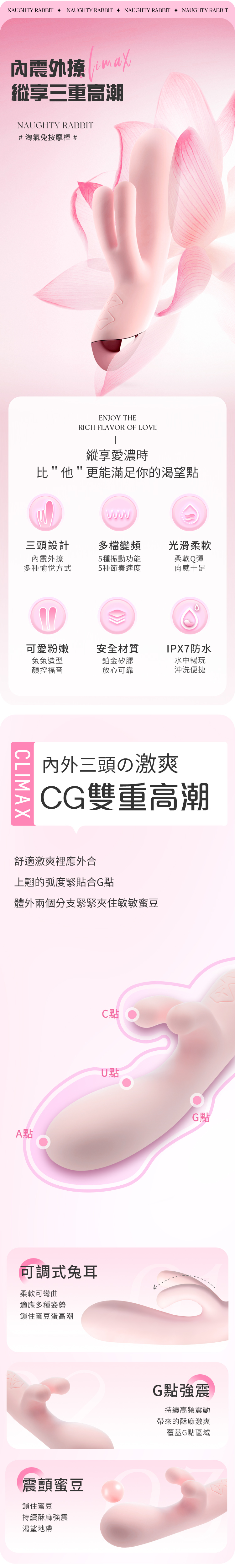 2. 三點高性能刺激:內震、外撩與三頭設計,實現多角度、多部位的深層滿足。