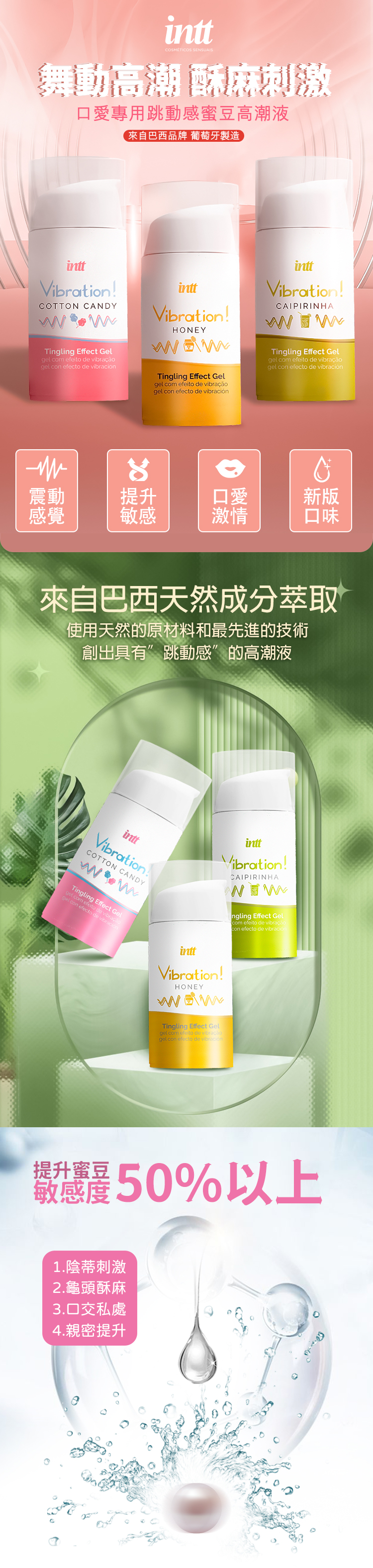 來自巴西頂尖品牌 Intt,Vibration 爆跳式高潮液採用巴西天然成分萃取,融合天然原材料與尖端技術,創造出能跳動感的全新高潮液,帶來前所未有的快感!