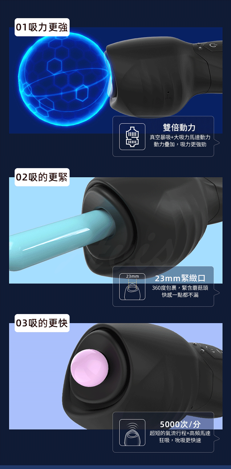 - 氣孔吸吮:模擬真實吸吮感,強力的吸吮效果可帶來深層刺激,促進龜頭鍛鍊與敏感度提升。