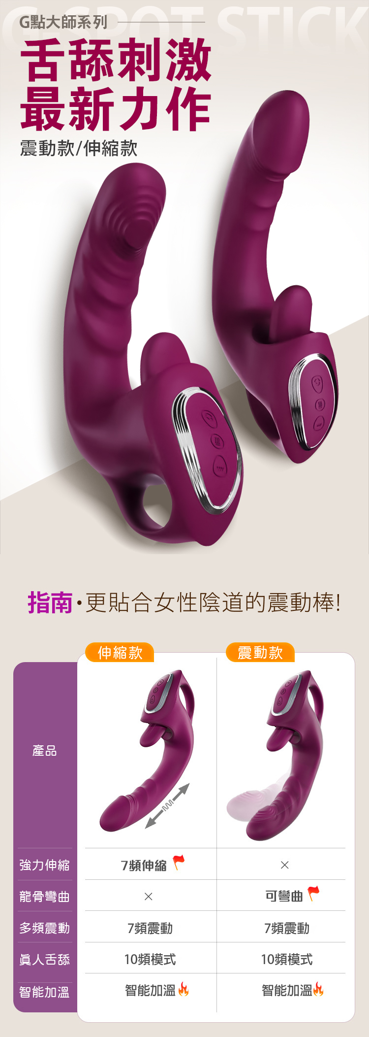 商品功能:10頻舌舔/7頻強震/自由彎曲/智能恆温